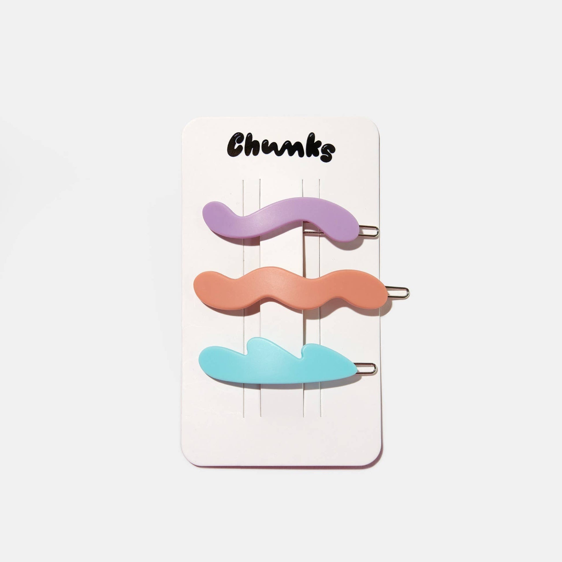 A set of three petite ball-and-clasp style barrettes. Perfect for holding back bangs or as little pops of color to any hair style.