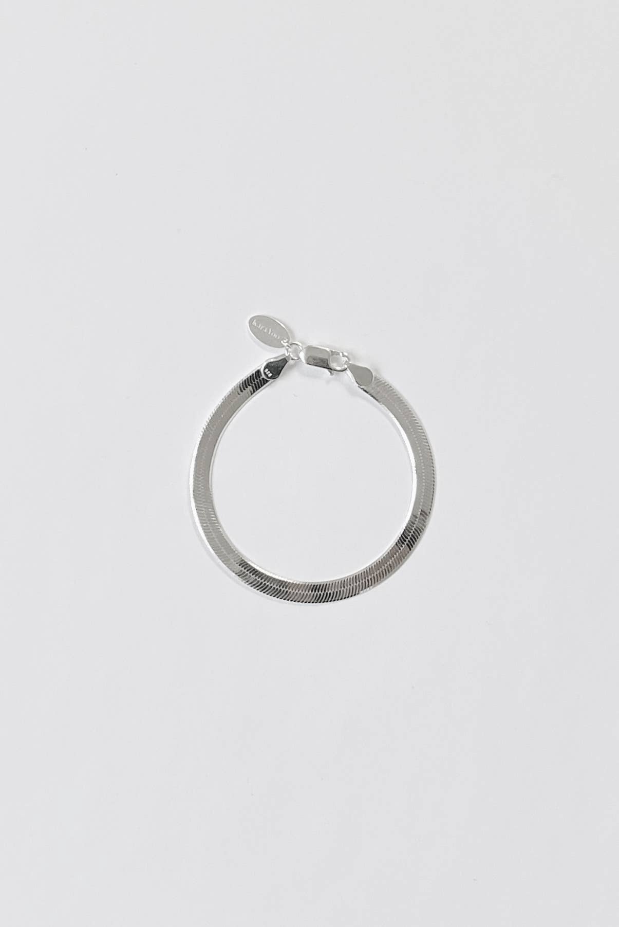 A mirror-finish classic herringbone chain in pure sterling silver. It's a little stiff as a bracelet so it acts kind of as an intermediary between a bracelet and bangle. A great layering piece. 6.75"-7.5" length.