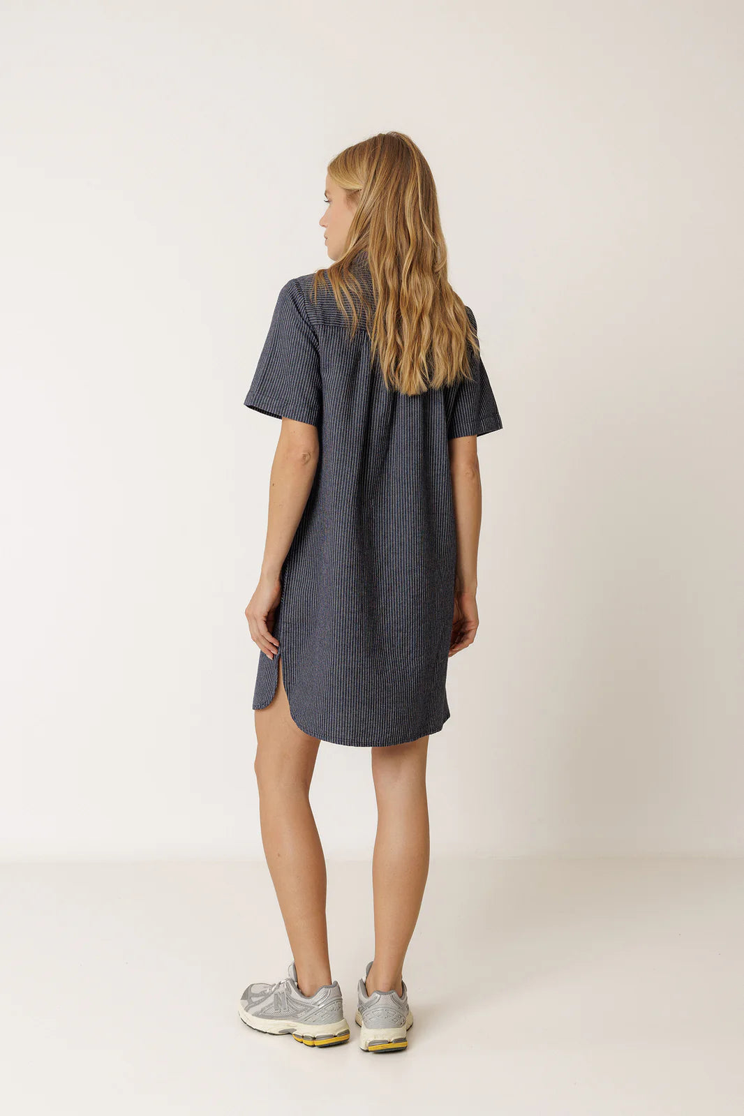 A relaxed pinstripe dress with a polo collar and button closure. A very versatile garment that you can use as a short dress or as a long shirt.