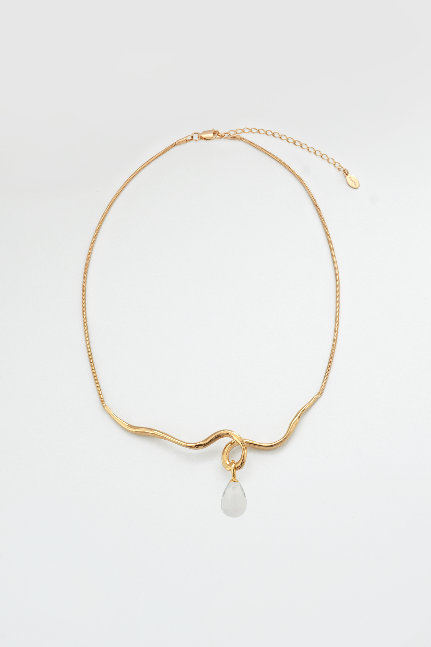 A loopy bar necklace that transitions seamlessly with a smooth snake chain. Comes with a small drop charm that slides directly onto the necklace (no hinged link necessary).