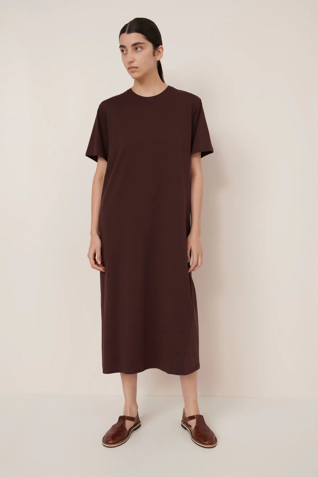 The Tee Dress is made from mid-weight organic cotton jersey in a deep Mahogany. It offers a relaxed fit and effortless midi length, and is detailed with our signature twisted side seams.