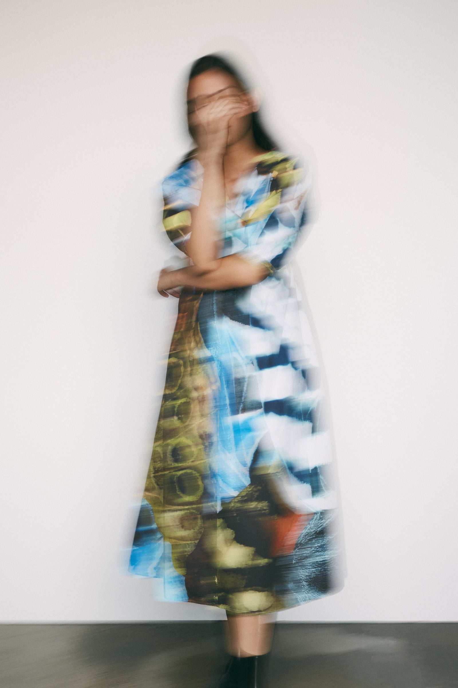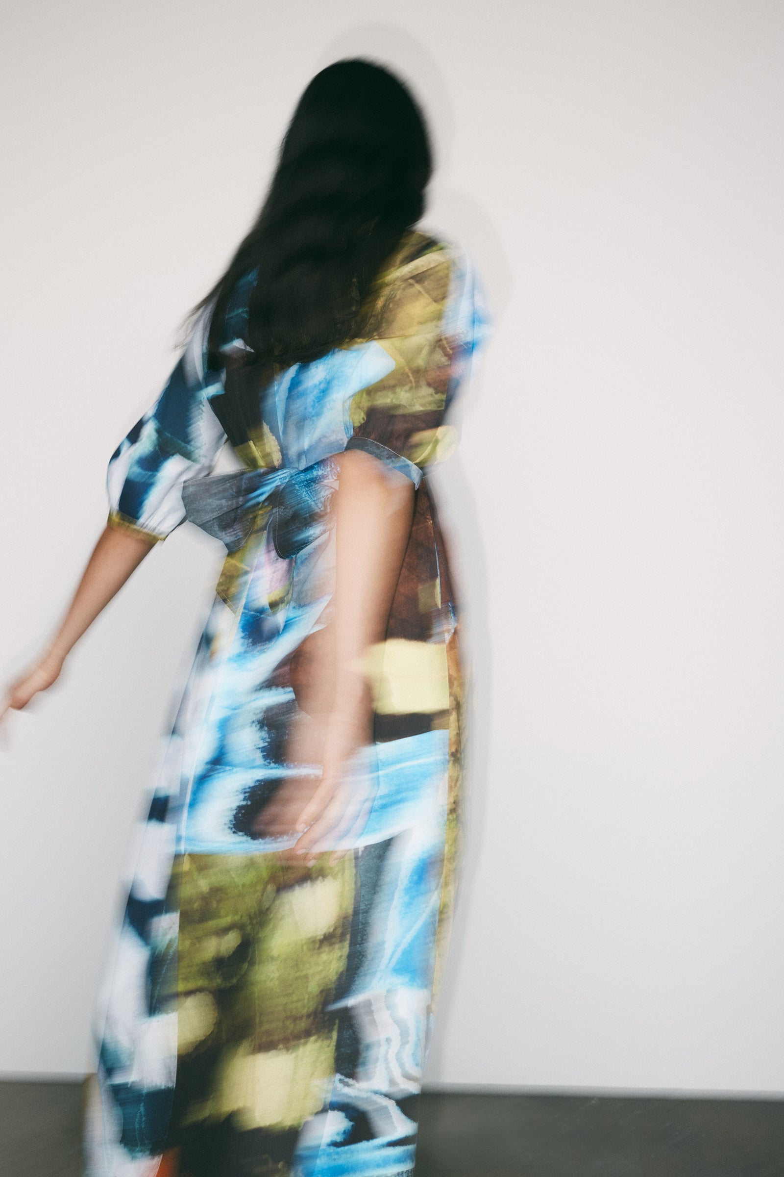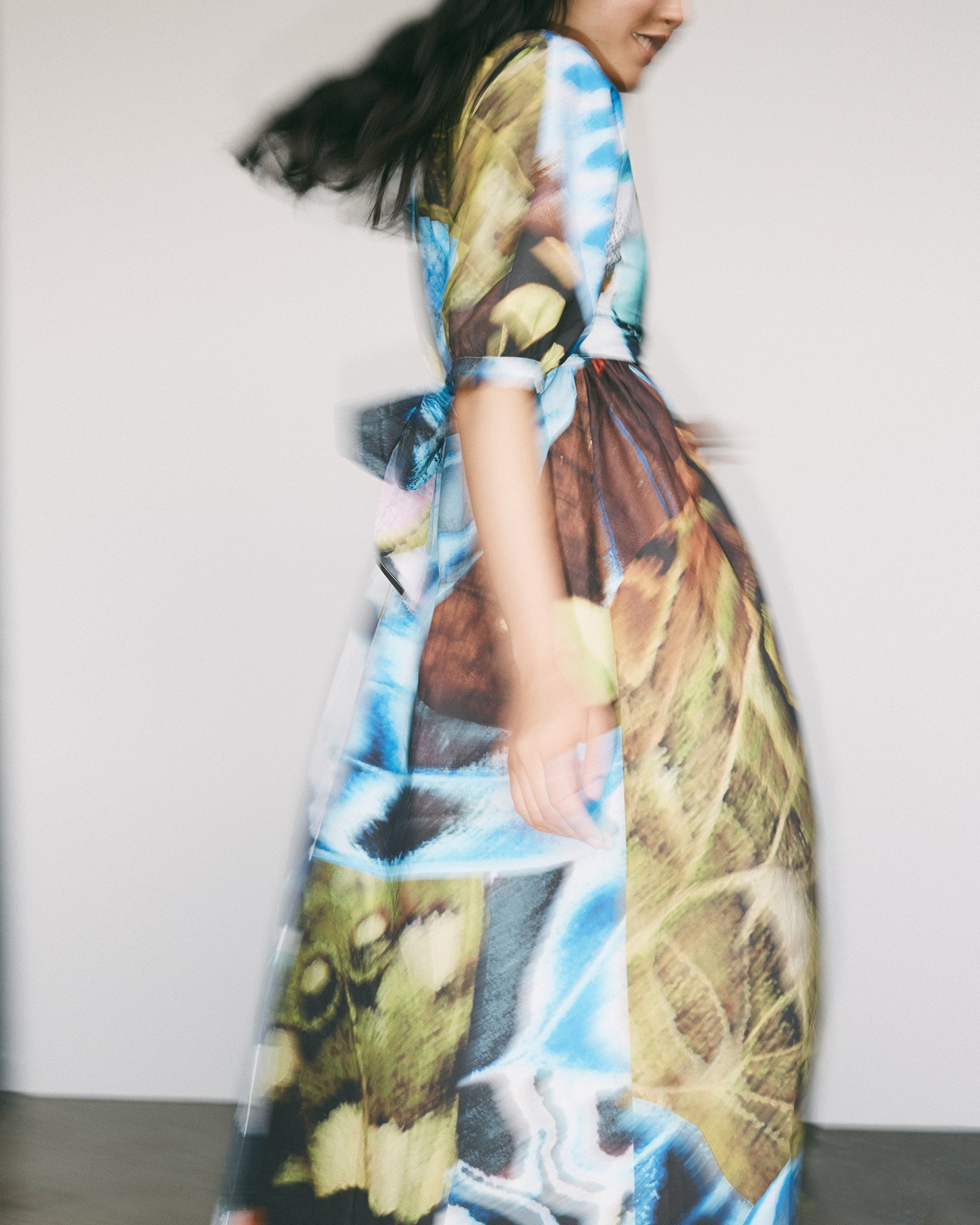 The Marta Dress is an artful style, defined by sculptural balloon sleeves and a wrap front detail which creates a flattering v-neckline. It features a standard fit with shaping through the back bodice, and inseam pockets for added ease. Crafted from organic cotton poplin shirting, it showcases our statement Monarch print — a design inspired by the intricate textures and vibrant colours of butterfly wings.