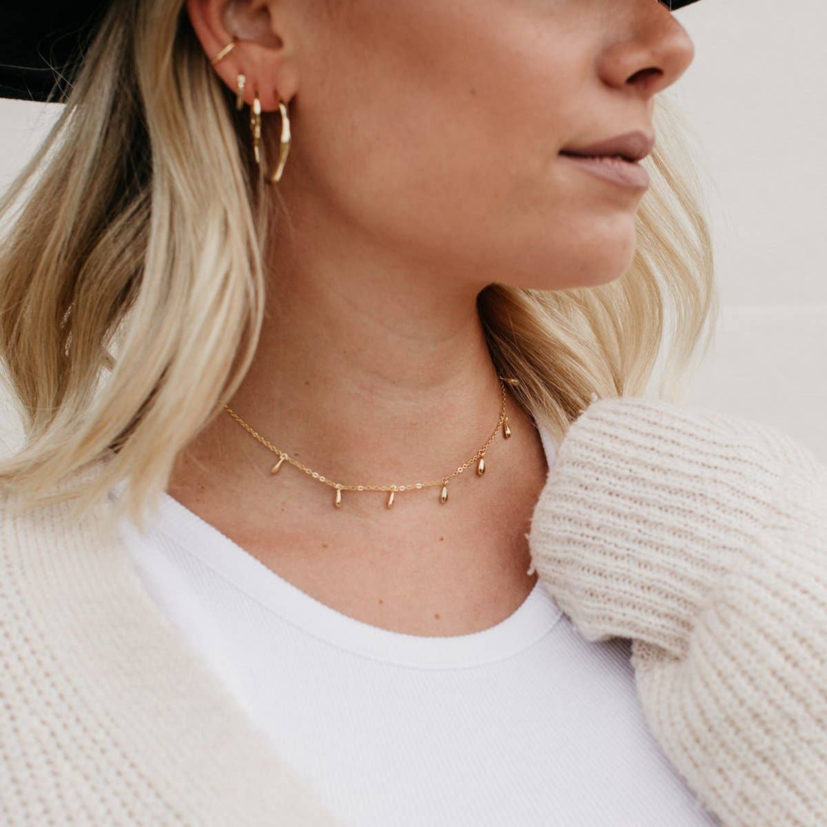Adjustable length choker with teardrop pendant Overview Pure 18k gold plating 30cm +7cm adjustable choker Perfect for layering Choker with teardrops Light weight: 2.8g Nickel free and allergy-friendly Features Details matter, gorgeous. Our stunning and favorite choker lea. our lea choker is complete with it's own teardrop pendants, making it beautiful on it's own or ready to complete a set. the pure 925 silver with e-coating of solid gold keeps your outfit allergy, and earth friendly!