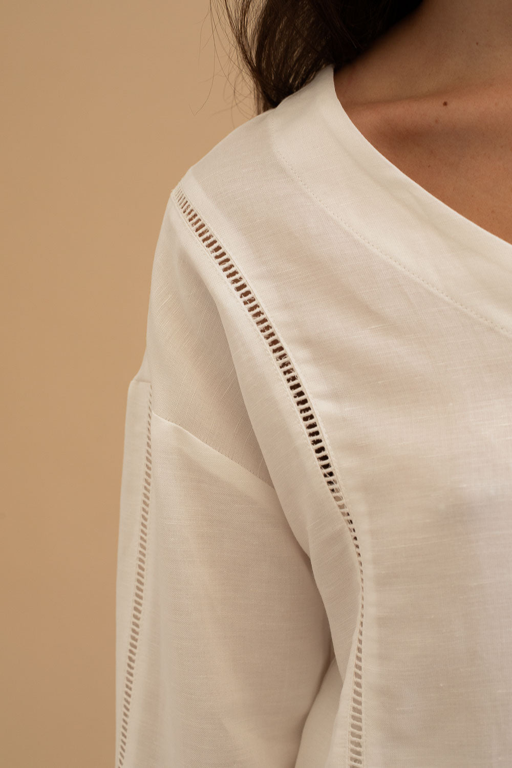 Marshall is a linen shirt with a V-neckline. It fastens with a button fastening on the front. It stands out for its interwoven trimming, which gives it a unique touch. Combine it with the Maliku trousers.