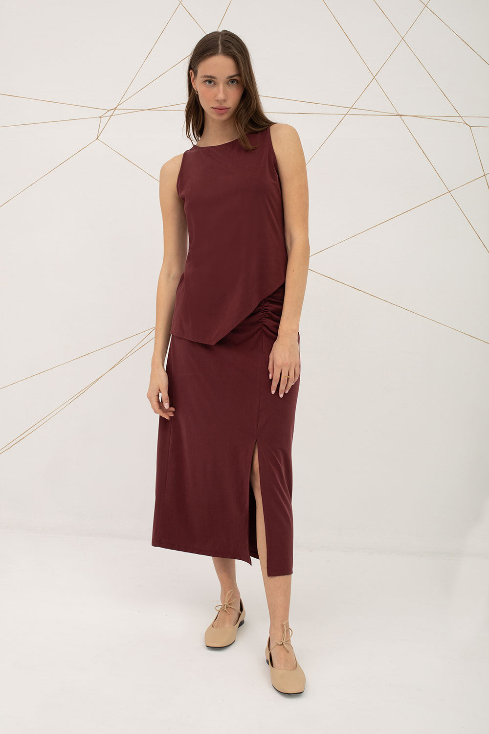 This sleeveless top features a unique design with a diagonal hem and a diagonal back neckline, offering a distinctive and elegant style to wear for a variety of occasions. Its cupro feel and look will win you over!