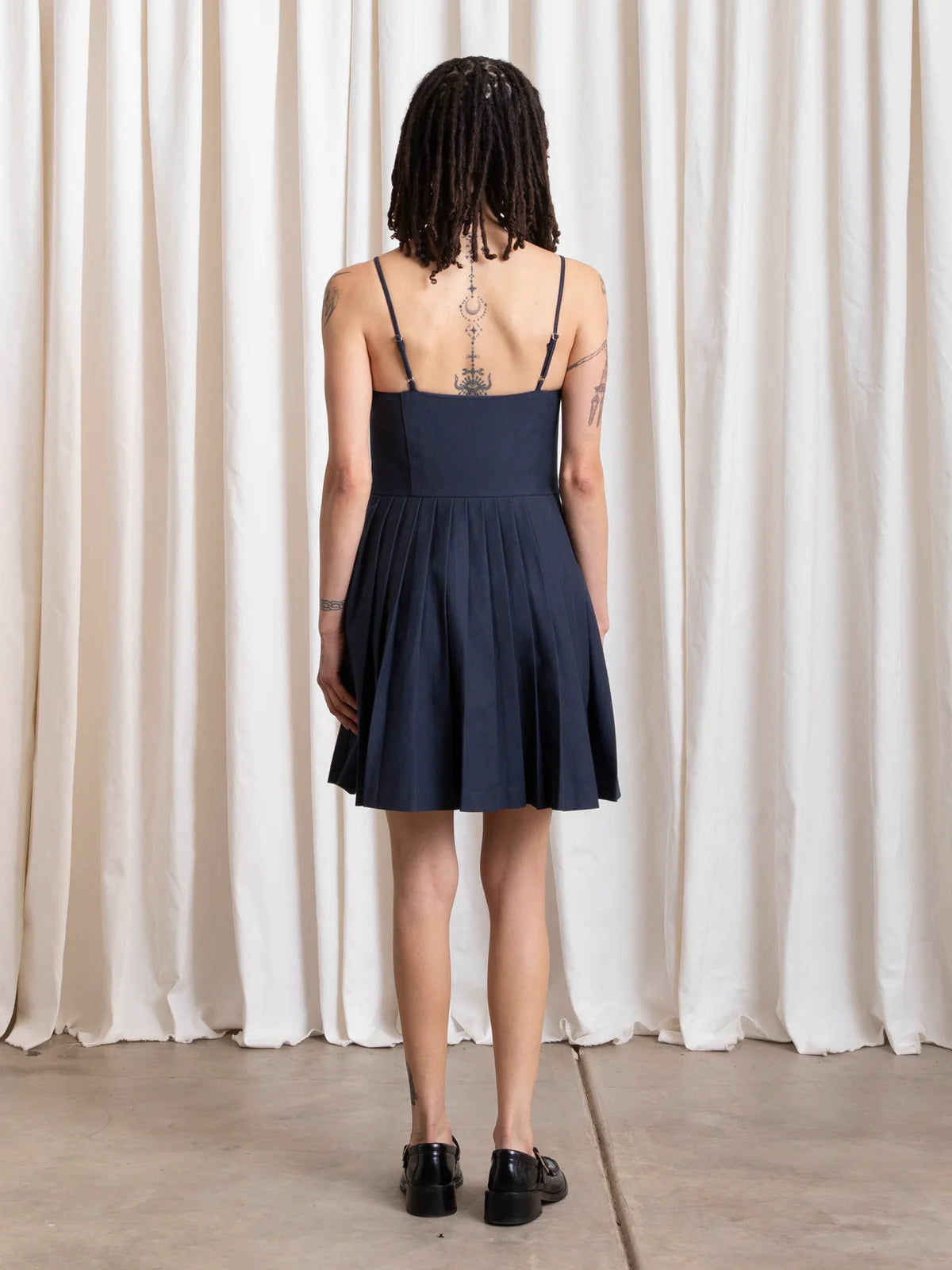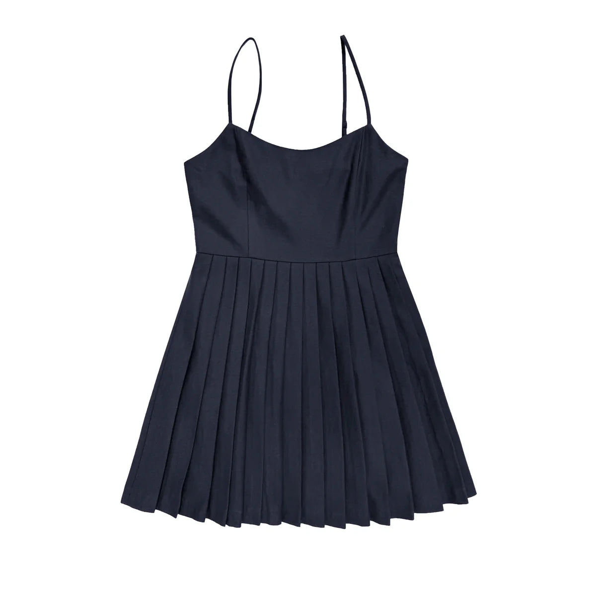 Structured cotton mini dress with fitted top and full pleated skirt. Has adjustable straps and invisible zipper in back.