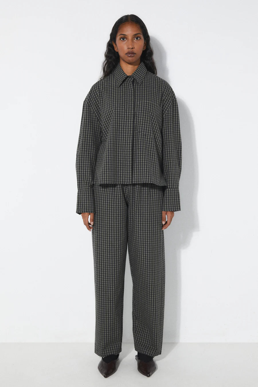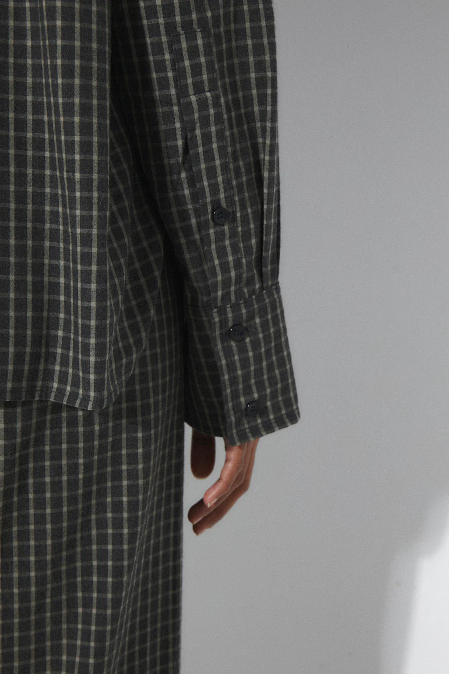 Shirt made of cotton yarn. Lapel collar and long sleeves with folded cuffs. Front patch pockets. Front button closure.