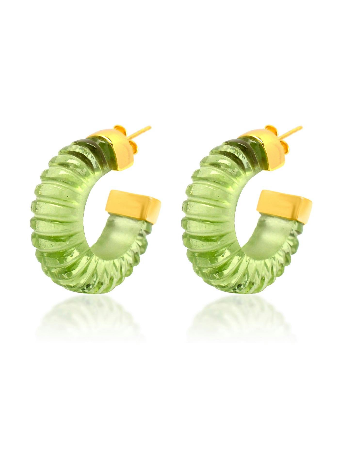 The Esme earrings are formed of specialised hand cut hydro glass. This modern handmade hoop earring has a thick gold tip at either side. The contrast with the colours and gold tips are stunning. They are the ideal style for everyday wear, finishing off any outfit elegantly. All metal is gold on sterling silver. All jewellery is hypoallergenic. All jewellery comes boxed with care cards.